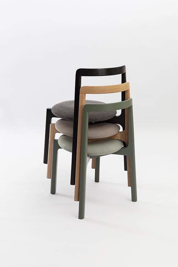 | Una silla liviana tanto espacial como visualmente: un asiento versátil y apilable. La silueta lineal recorre el espacio. Las curvas y la calidez de la madera suavizan la forma geométrica de la pieza. Estructura en madera de roble natural o lenga (natural o pintada). Asiento tapizado en textil. | ![]() | |